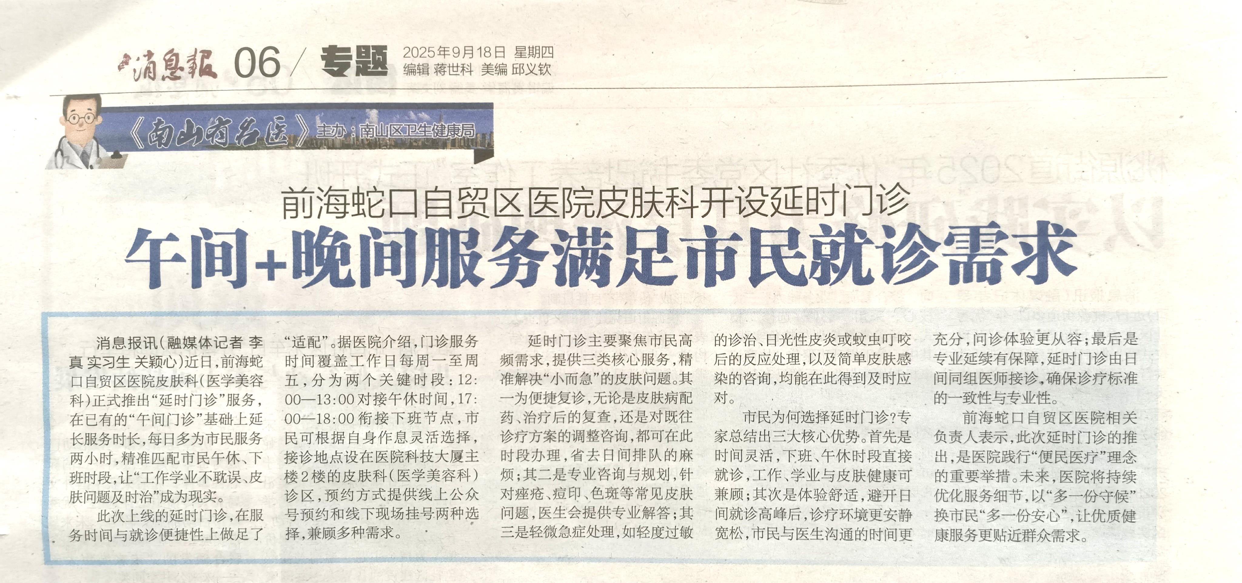 前海蛇口自贸区医院皮肤科开设延时门诊 午间+晚间服务满足市民就诊需求(转自蛇口消息报20250918期A06版)