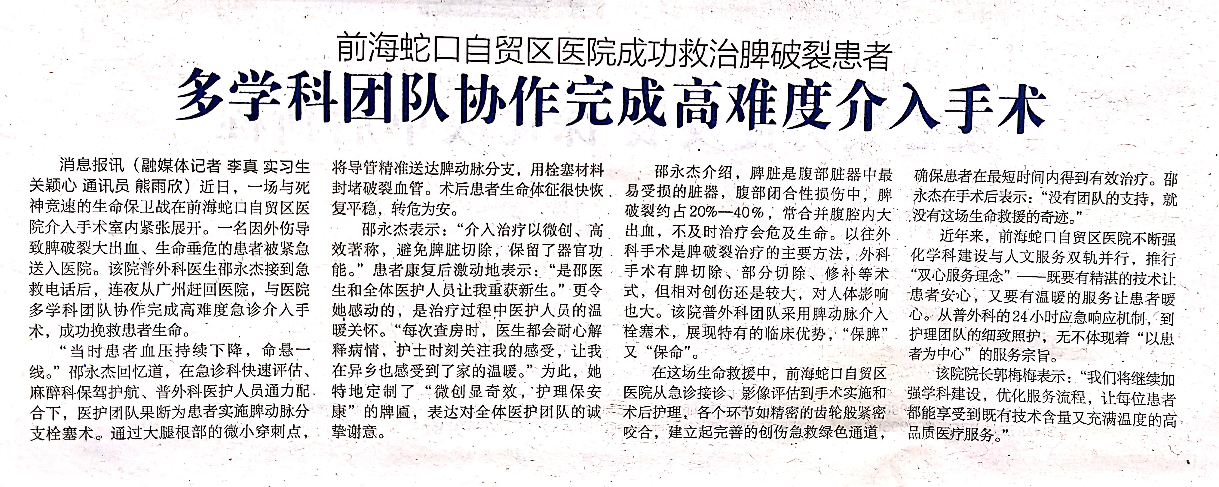 前海蛇口自贸区医院成功救治脾破裂患者 多学科团队协作完成高难度介入手术(转自蛇口消息报20251022期A07版)