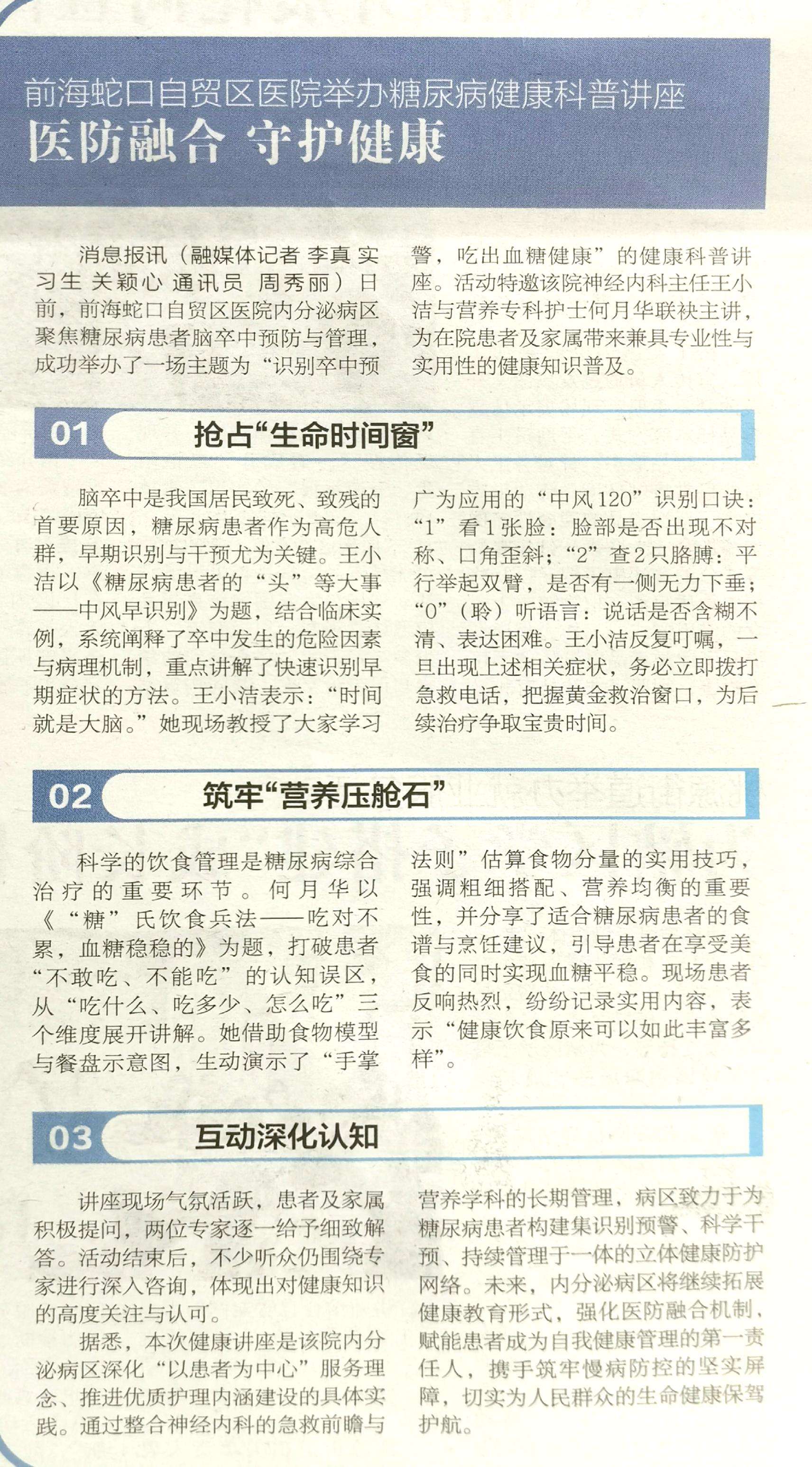 前海蛇口自贸区医院举办糖尿病健康科普讲座 医防融合 守护健康(转自蛇口消息报20251105期A06版)