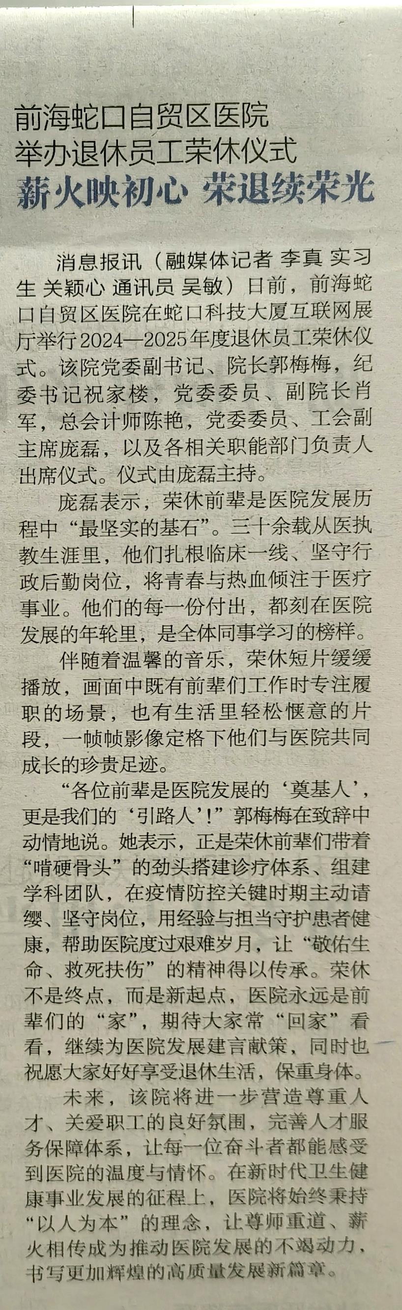 前海蛇口自贸区医院举办退休员工荣休仪式 薪火映初心 荣退续荣光(转自蛇口消息报20251112期A08版)