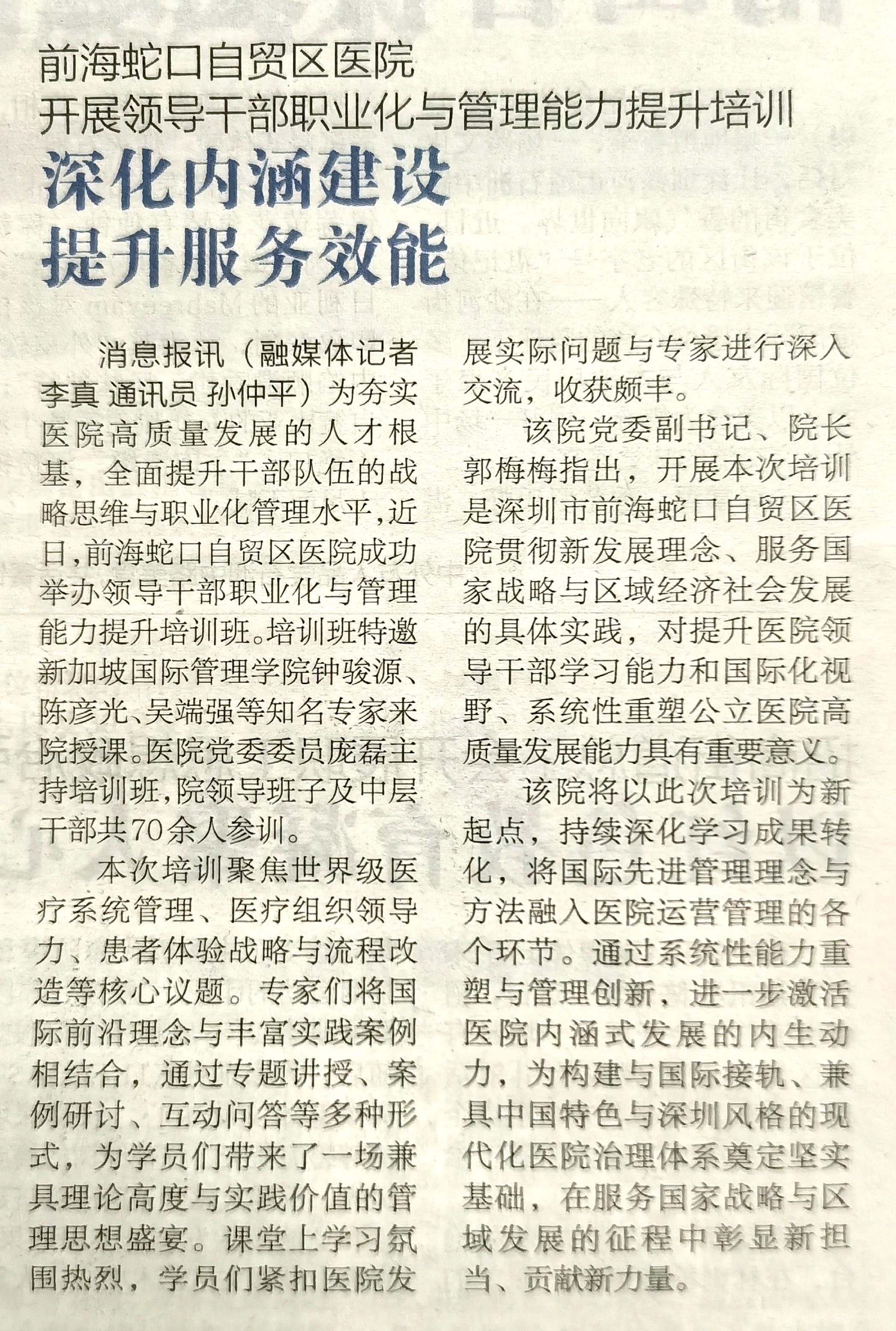 前海蛇口自贸区医院开展领导干部职业化与管理能力提升培训 深化内涵建设 提升服务效能(转自蛇口消息报20251126期A06版)