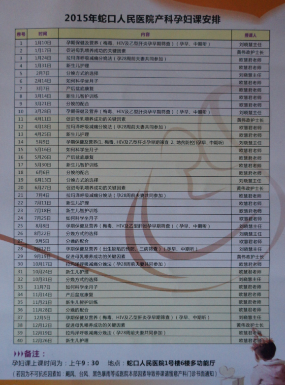 2015年蛇口人民医院产科孕妇学校课表(大课)