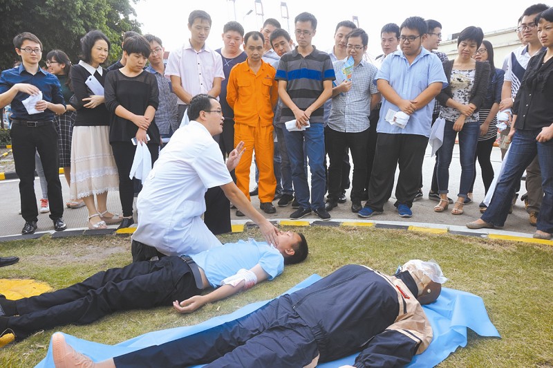 演习模拟海运大厦3楼发生火情,控制室接到火警信号,迅速通知保安人员前去确认火警点,并组织大厦内工作人员沿消防安全通道撤离。该物业公司消防小组接到指示后火速赶到现场扑灭大火,并把伤员送到医院救护点。到达救护点后,社康医生立即实施伤员的救治。演习取得圆满成功,加强了社区居民及工作人员的消防安全意识,增强了急救技能。