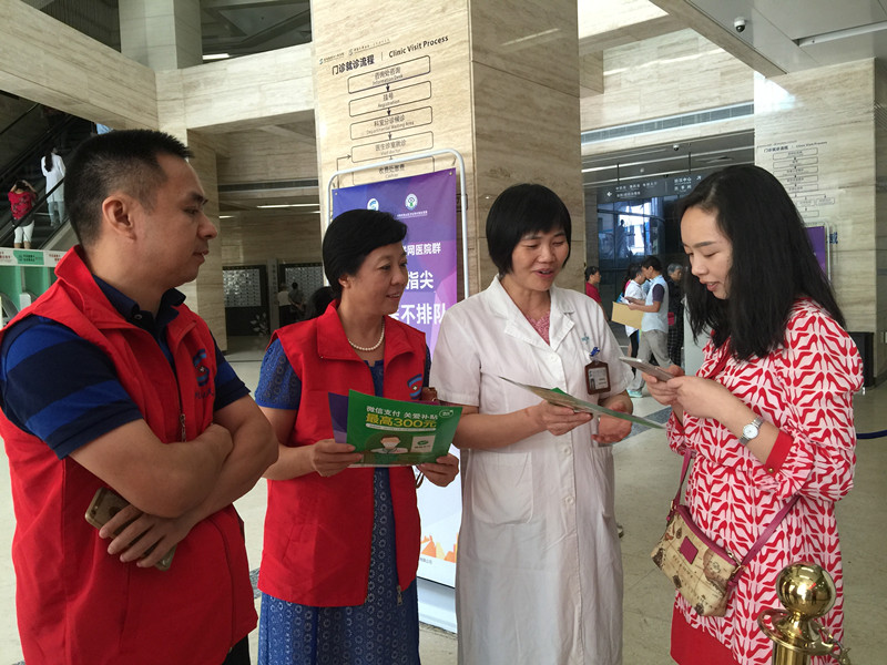 本网讯 (编辑 吴俊 孙佳隆 通讯员 王霏)日前一天的早晨8点多,妈妈梁女士抱着3岁宝宝在蛇口医院一楼门诊大厅收费窗口焦急地等候排队挂号,旁边身穿红马甲的医院党员志愿者们见状上前问候:“您好!您可以关注南山看病易的微信公众号,绑定就诊卡后立即挂号和缴费,不用排队,而且现在还有优惠哦。”