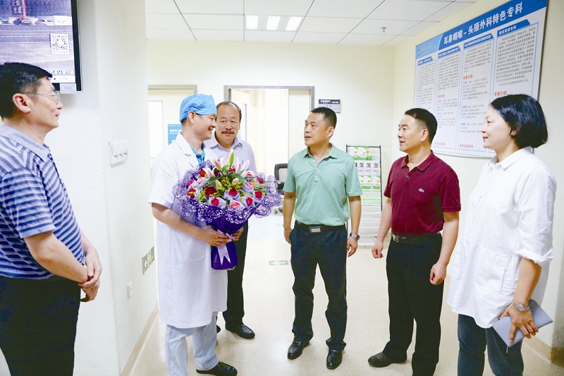 当日下午,该院领导班子携相关职能部门主任深入科室,分别向省劳模、医师杨睿,市劳模、副院长吴文清,区劳模、科主任覃纯初和科主任张永建献花。
