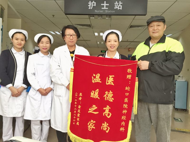 本网讯(编辑 吴俊 孙佳隆 通讯员 BANNED WORD)日前,蛇口医院神经内科收到了患者翁莲霞家属亲自送来的一面锦旗,“医德高尚,温暖之家”是患者翁莲霞老奶奶一家人对神经内科的温暖表达。