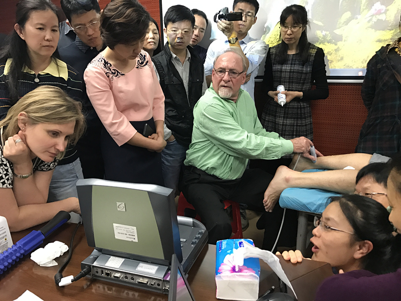 培训采取看诊的形式进行教学,一级学员提前准备好病历并翻译成英文,美国老师查看病历后和一级学员一起现场接诊病人,从全科角度出发,认真的采集病史及体格检查。美国老师向我们展现了家庭医生大伽看病的风范:以病人为中心的诊疗模式,不用药或少用药看好病。