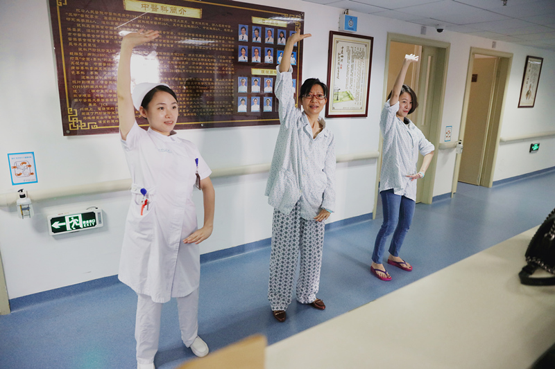 现在每天早上7:30,踏进中医康复病区时都能看到一幅特别的画面,走廊上的移动电脑放着八段锦轻松的音乐,护士带领患者认真的做着八段锦。