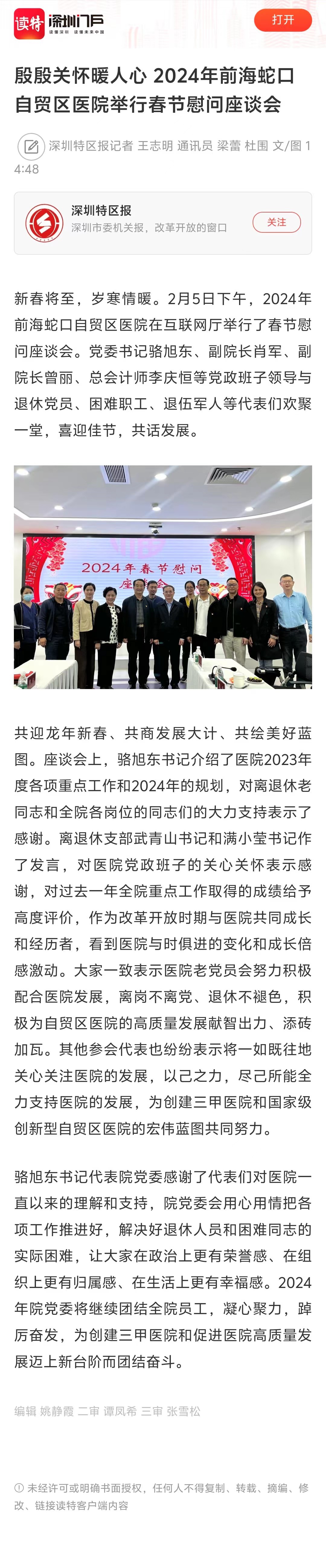 殷殷关怀暖人心 2024年前海蛇口自贸区医院举行春节慰问座谈会(转自读特网20240207)