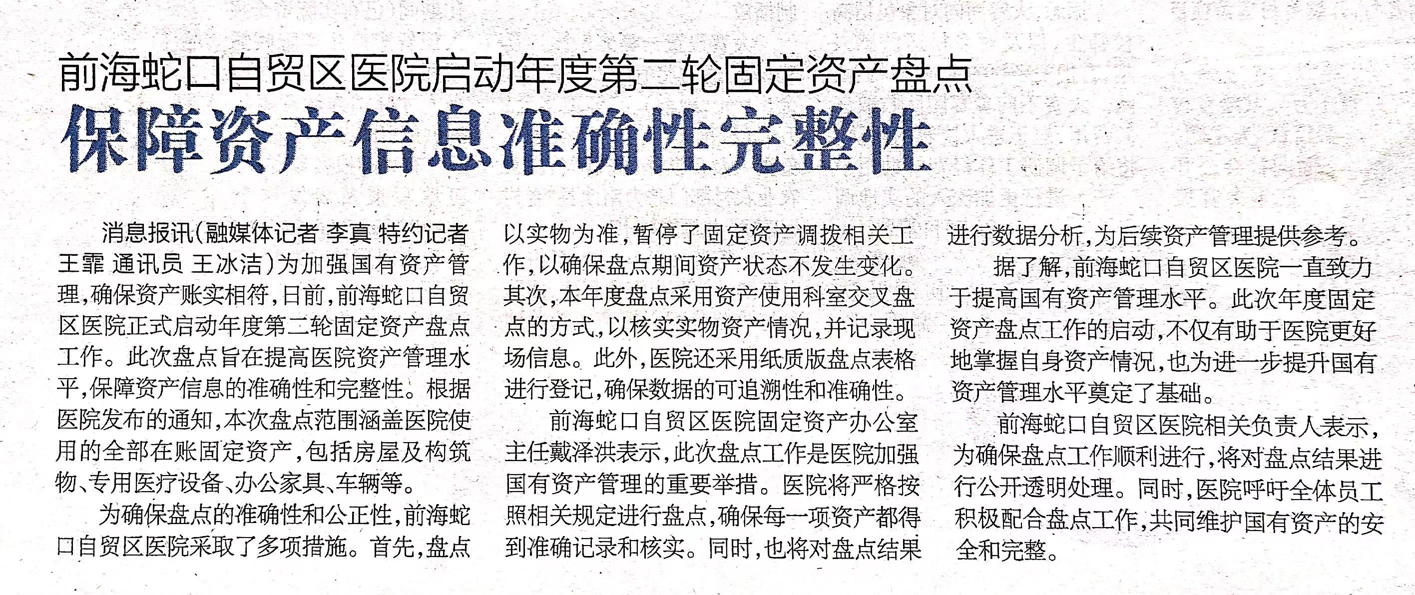 前海蛇口自贸区医院启动年度第二轮固定资产盘点 保障资产信息准确性完整性(转自蛇口消息报20240410期A06版)