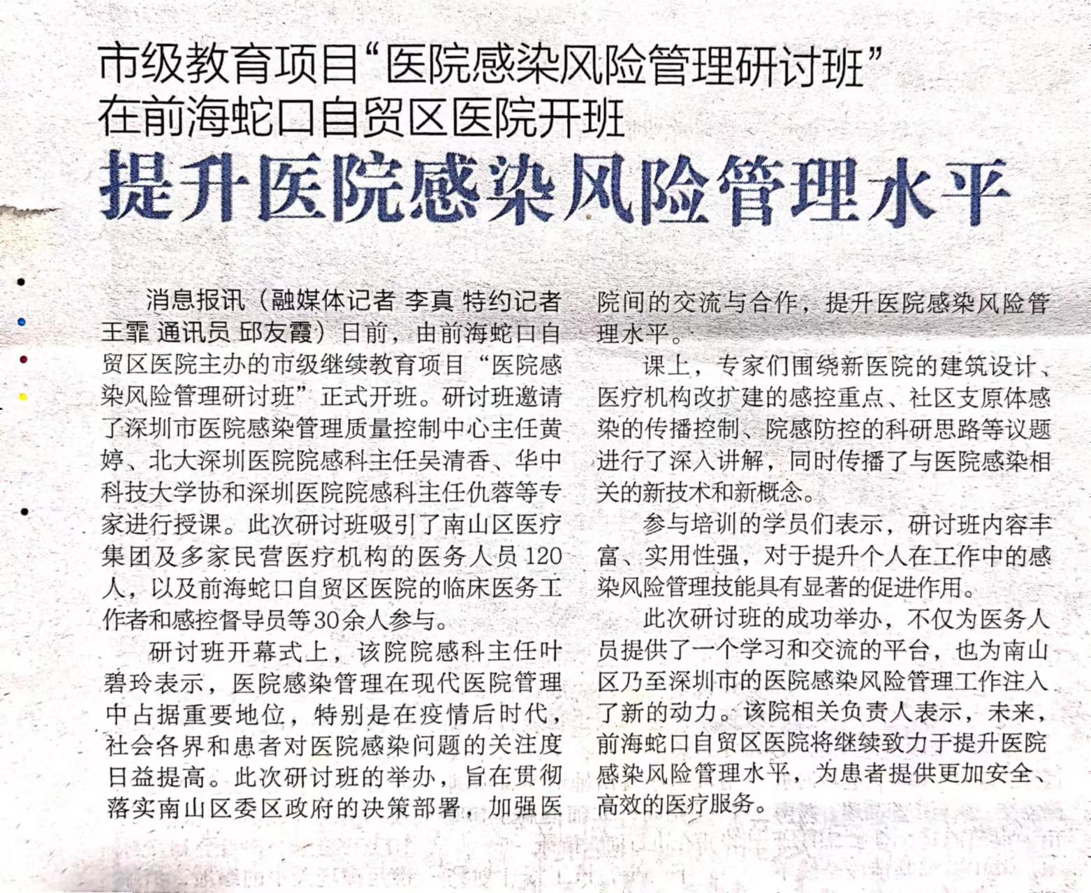 市级教育项目“医院感染风险管理研讨班”在前海蛇口自贸区医院开班 提升医院感染风险管理水平(转自蛇口消息报20240515期A06版)