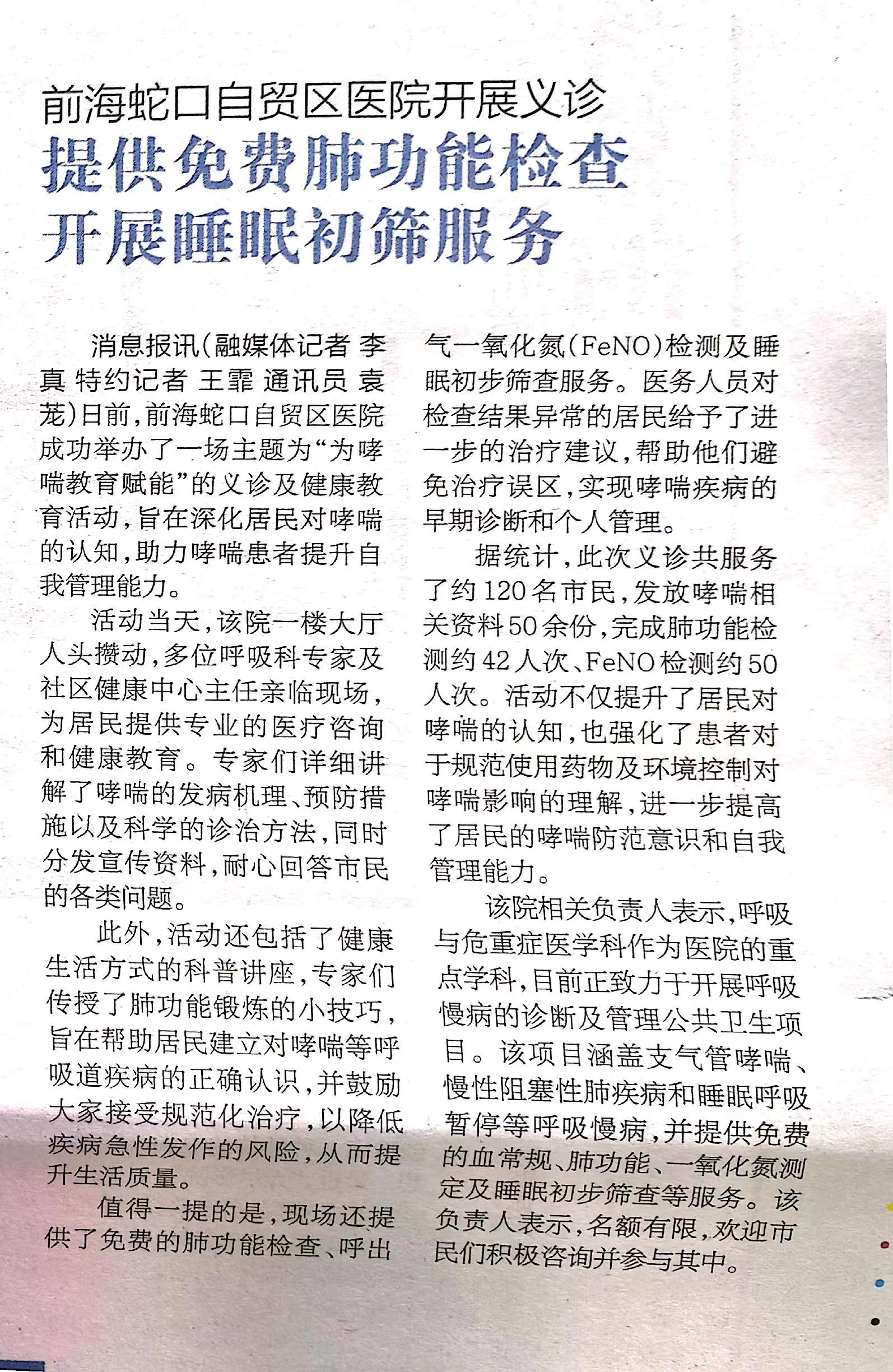 前海蛇口自贸区医院开展义诊 提供免费肺功能检查 开展睡眠初筛服务(转自蛇口消息报20240515期A07版)