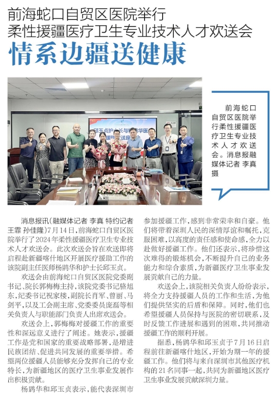前海蛇口自贸区医院举行柔性援疆医疗卫生专业技术人才欢送会 情系边疆送健康(转自蛇口消息报20240717期A06版)