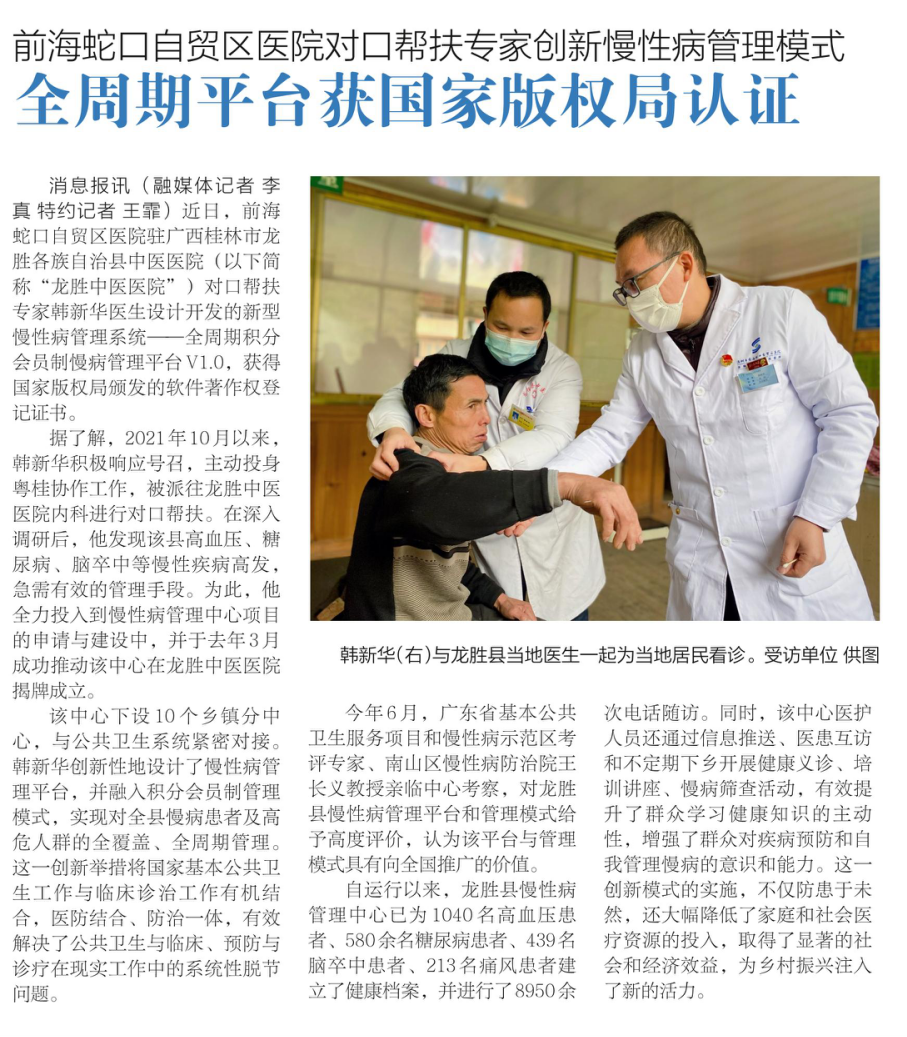 前海蛇口自贸区医院对口都扶专家创新慢性病管理模式 全周期平台获国家版权局认证(转自蛇口消息报20240808期A07版)