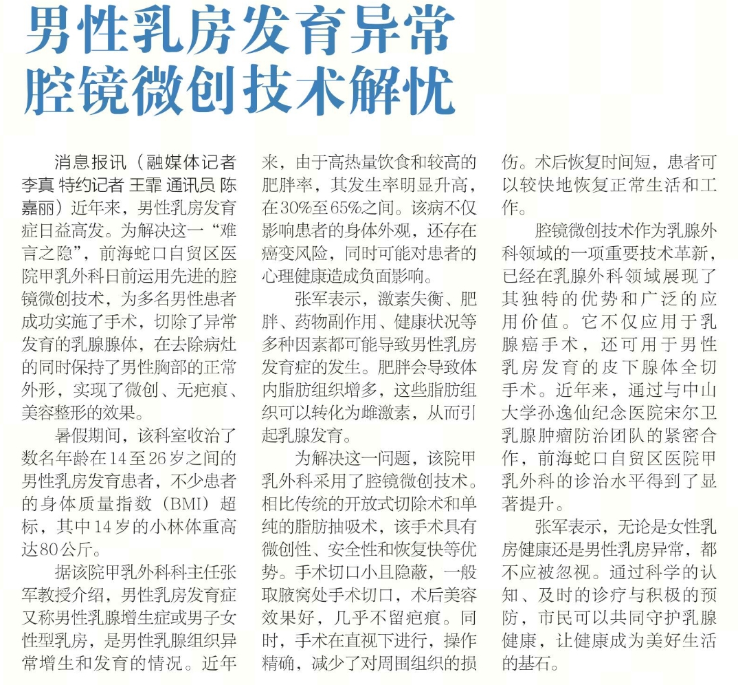 男性乳房发育异常 腔镜微创技术解忧(转自蛇口消息报20240814期A06版)