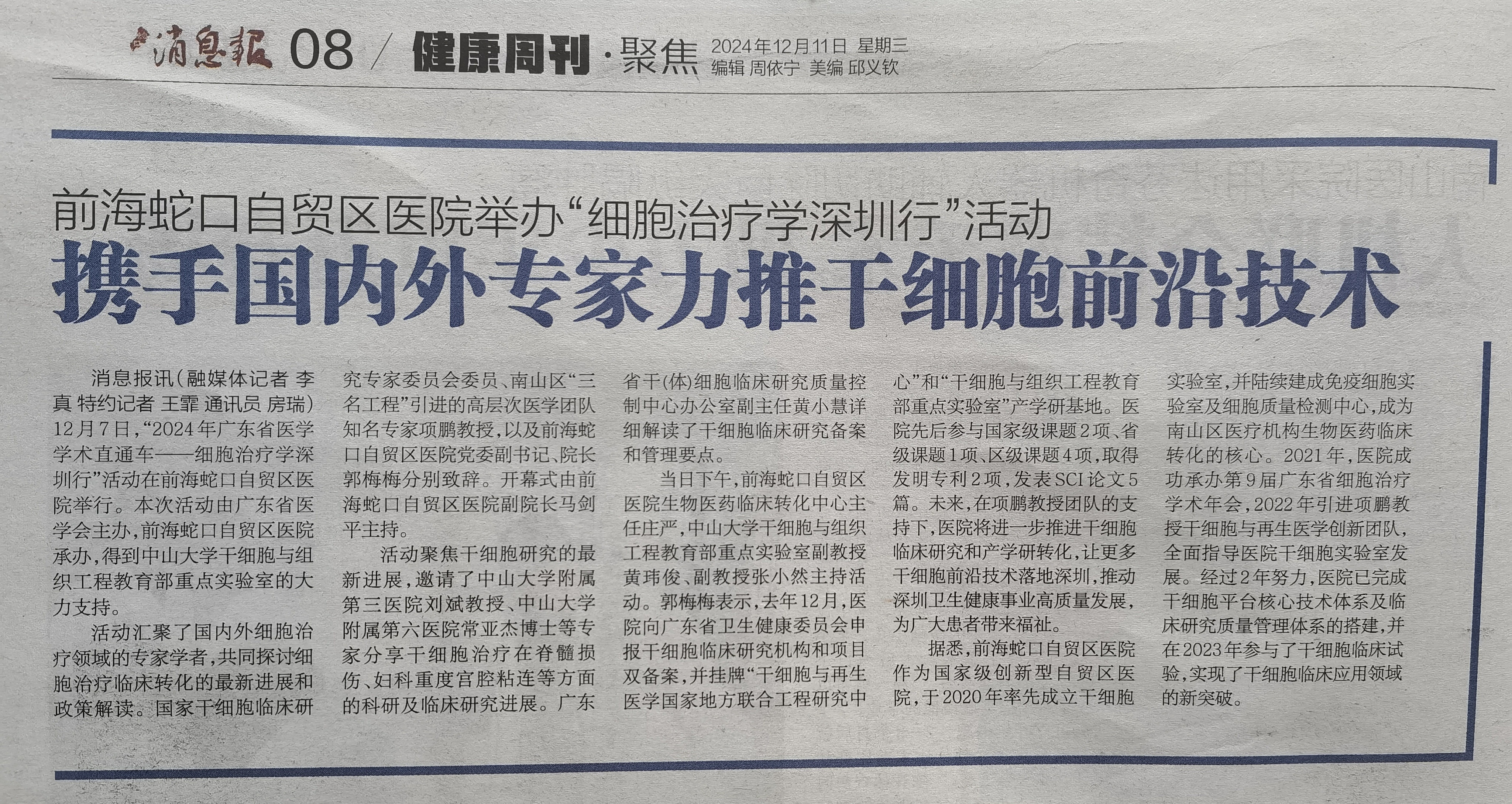 前海蛇口自贸区医院举办“细胞治疗学深圳行”活动 携手国内外专家力推干细胞前沿技术(转自蛇口消息报20241211期A08版)