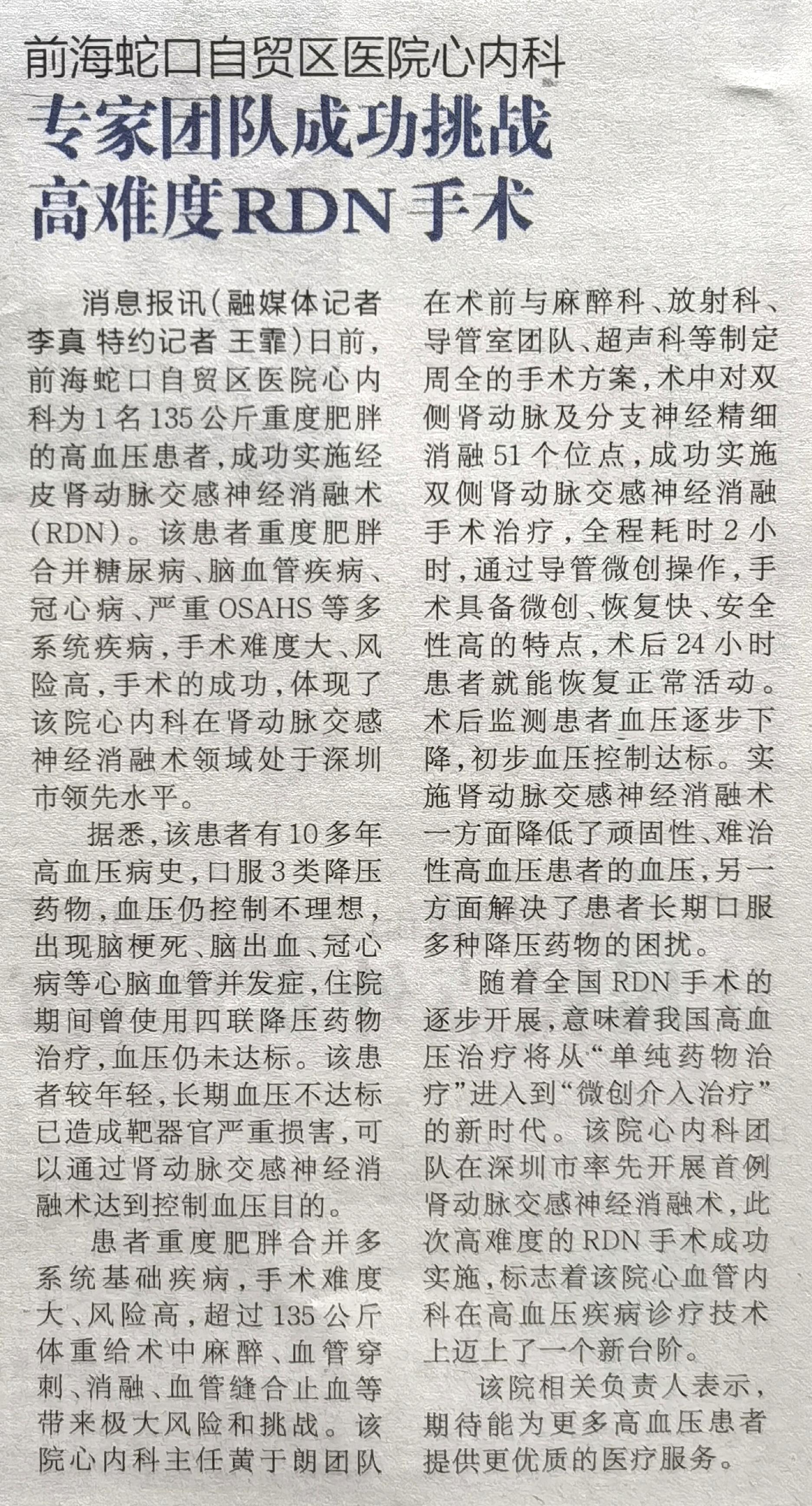 前海蛇口自贸区医院心内科专家团队成功挑战高难度RDN手术(转自蛇口消息报20250508期A06版)