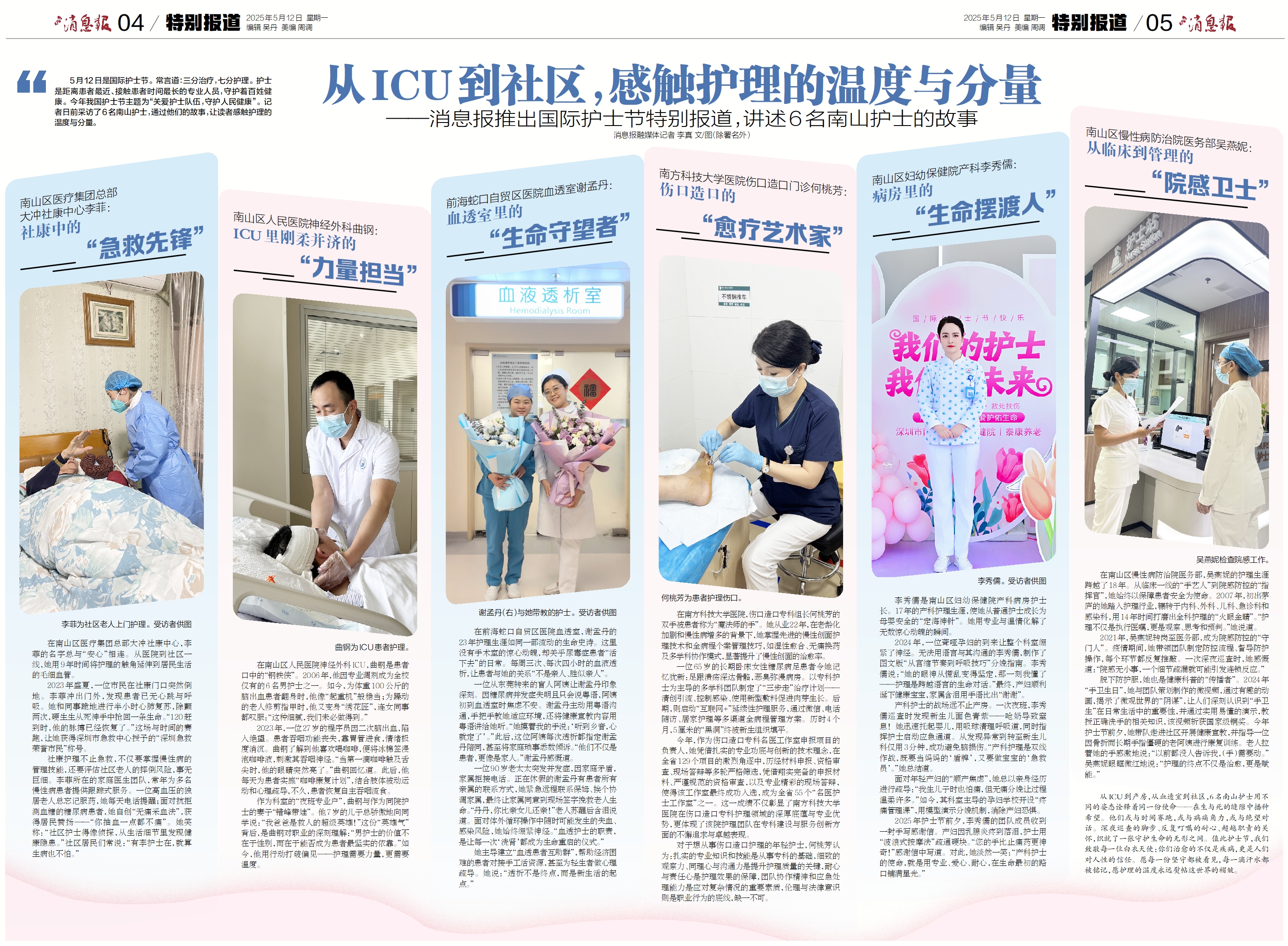从ICU到社区,感触护理的温度与分量 消息报推出国际护士节特别报道,讲述6名南山护士的故事(转自蛇口消息报20250512期A04-05版)