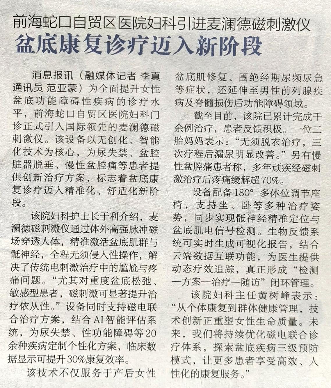 前海蛇口自贸区医院妇科引进麦澜德磁刺激仪 盆底康复诊疗迈入新阶段(转自蛇口消息报20250521期A07版)