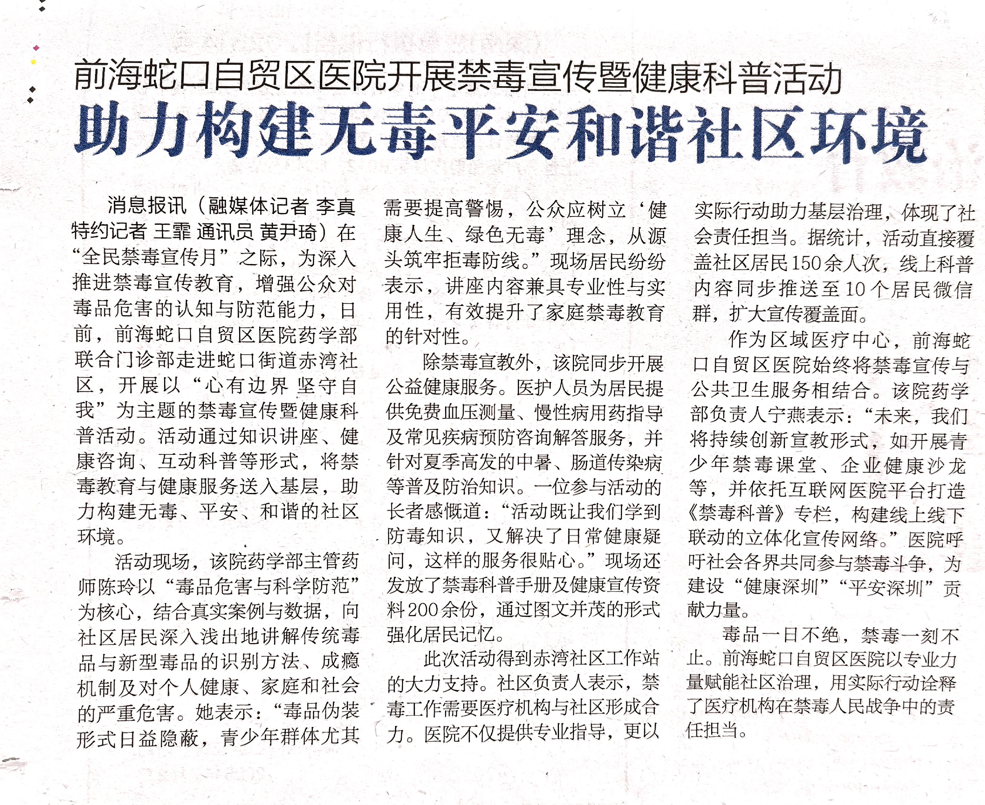 前海蛇口自贸区医院开展禁毒宣传暨健康科普活动 助力构建无毒平安和谐社区环境(转自蛇口消息报20250702期A06版)
